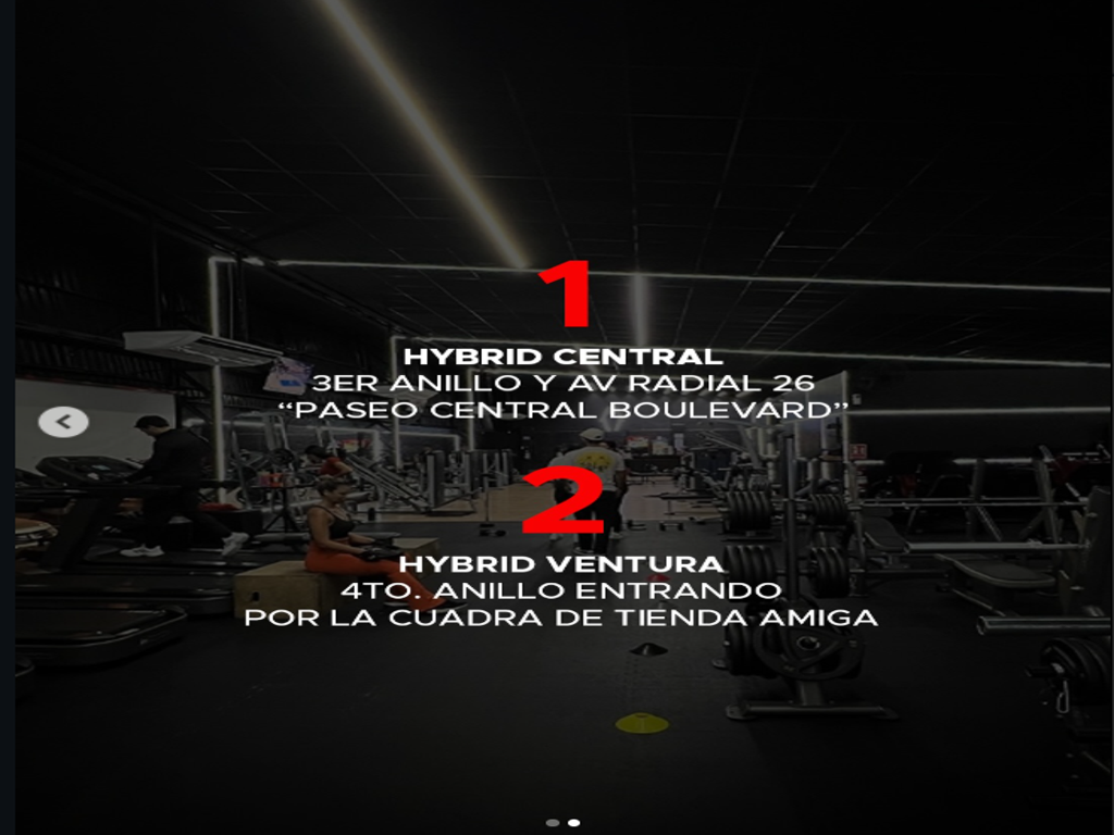 Hybrid es una cadena de gimnasios con presencia en Santa Cruz de la Sierra, Bolivia, operando actualmente con dos sucursales. Su propuesta se centra en un entrenamiento híbrido que combina lo mejor del gimnasio tradicional con técnicas de calistenia, ofreciendo a sus miembros una experiencia de fitness integral, eficiente y versátil, adaptada a todos los niveles de entrenamiento. Con visión de crecimiento regional, Hybrid proyecta expandirse a otras ciudades de Bolivia, consolidando un modelo de entrenamiento innovador y replicable. Su misión es liderar la transformación del sector fitness en el país, ofreciendo espacios de alta calidad, programas especializados y un enfoque que integra fuerza, movilidad y funcionalidad en cada rutina.